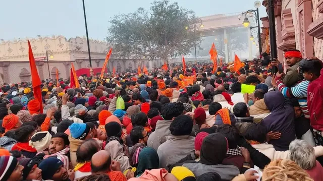 People who had been camping in Ayodhya since before the consecration ceremony waited in long queues outside the temple. Security personnel maintained order as the crowd grew, and at one point, the crowd became so large that security personnel struggled to control it.