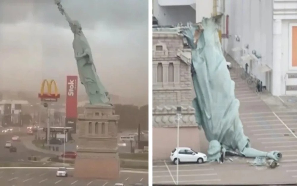 A massive replica of the Statue of Liberty collapsed under powerful gusts of wind in the city of Guaíba near Porto Alegre in Brazil.