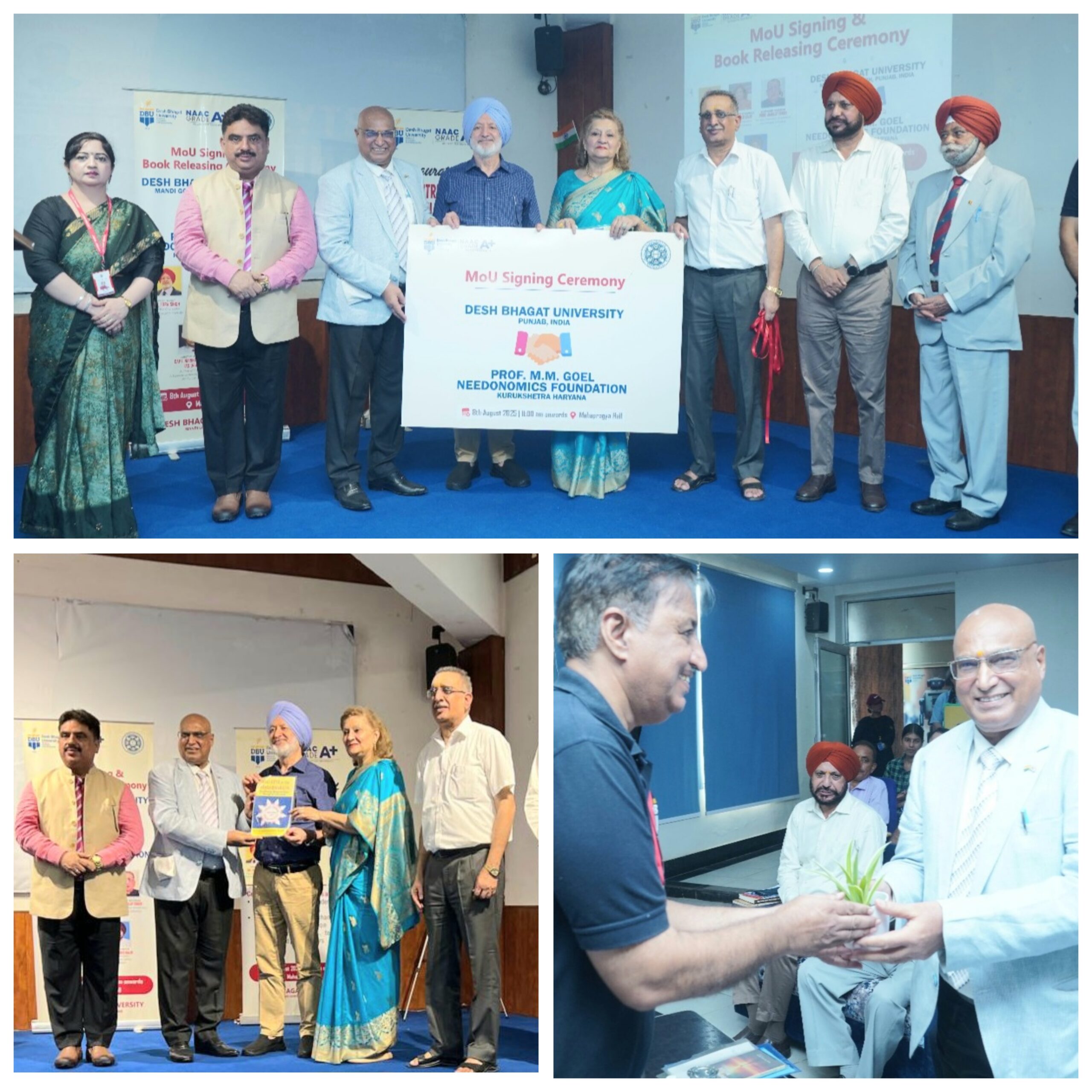 Mandi Gobindgarh, 8th August: In a significant move to integrate Indian ethical thought into contemporary academic discourse, Centre for South Asian Studies Desh Bhagat University has signed a Memorandum of Understanding (MoU) with the Prof. M.M. Goel Needonomics Foundation. The collaboration aims to advance value-based research, ethical governance, and sustainable development through the lens of “Needonomics”—a paradigm propounded by Prof. M.M. Goel as an antidote to mindless Greedonomics.