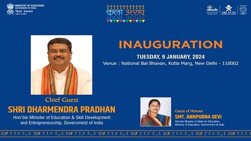 New Delhi, 9th Jan. Union Minister for Education and Skill Development & Entrepreneurship Dharmendra Pradhan, will attend the inaugural ceremony of the Kala Utsav as the Guest of Honour on 9th January 2024.