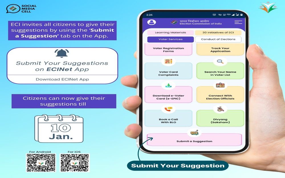 New Delhi, 4th Jan: The Election Commission of India (ECI) has invited citizens to download the ECINet App and submit suggestions to help improve the platform by January 10, 2026.