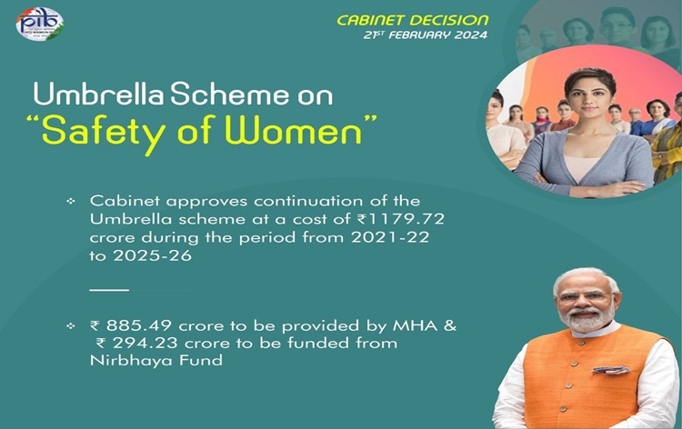 New Delhi, 22nd Feb. The Union Cabinet, chaired by Prime Minister Narendra Modi, has given the approval to the Ministry of Home Affairs’ proposal for the continuation of the implementation of the Umbrella Scheme on ‘Safety of Women’. The scheme will be executed at a total cost of Rs. 1,179.72 crore spanning the period from 2021-22 to 2025-26.