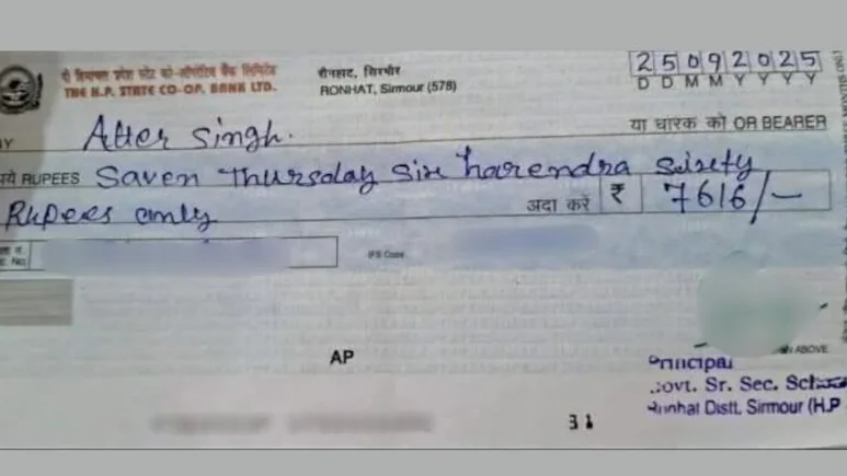 Himachal School Principal’s Cheque Goes Viral Over Spelling Blunders