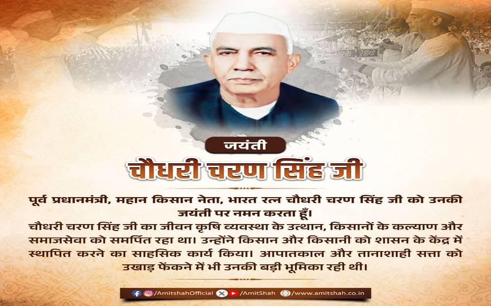 In a post on X, Amit Shah said Chaudhary Charan Singh dedicated his entire life to strengthening the agricultural system, ensuring the welfare of farmers and serving society. He noted that the former Prime Minister courageously placed farmers and agriculture at the centre of governance at a time when rural concerns often remained sidelined.