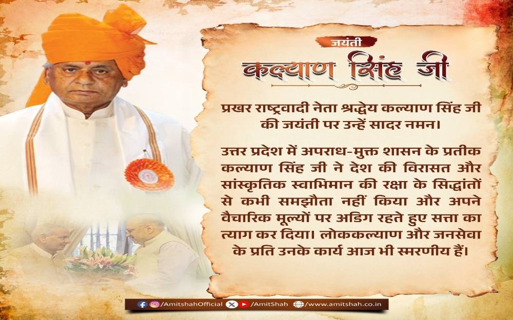 New Delhi, 5th Jan: Union Home Minister and Minister of Cooperation, Amit Shah, paid tributes to former Uttar Pradesh Chief Minister Kalyan Singh on his birth anniversary, remembering him as an ardent nationalist leader who remained steadfast in his ideological principles.