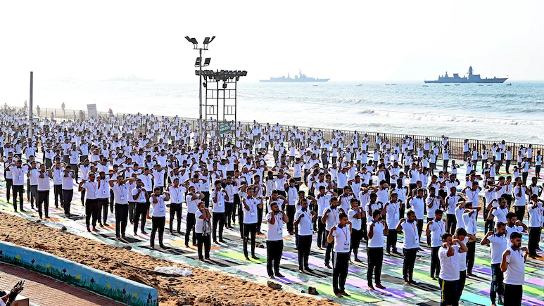 The vibrant event saw participation from across society — political leaders, bureaucrats, students, professionals, senior citizens, tribal communities, and women — all performing yoga asanas in unison along the scenic coastline. About 11,000 Navy personnel and family members joined from the Eastern Naval Command, with yoga sessions also conducted aboard naval vessels anchored offshore.