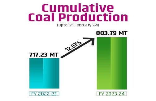New Delhi, 9th Feb. India’s coal production has reached 803.79 MT for the fiscal year 2023-24 as of February 6th, 2024, marking a substantial increase from the 717.23 MT recorded during the same period of the previous fiscal year, showcasing a notable growth rate of 12.07%.