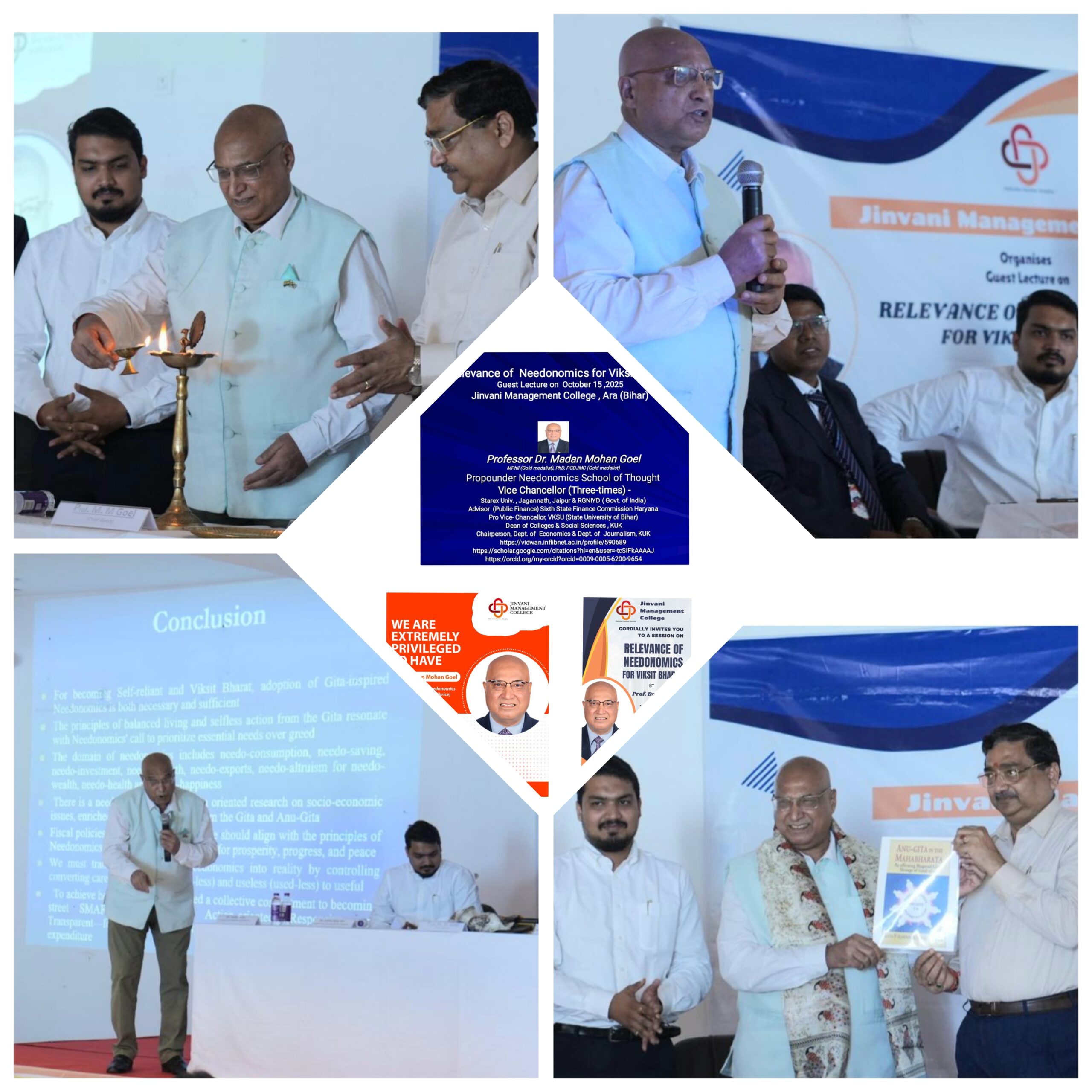 Ara, 16th October: – To be ready for Viksit Bharat towards 2047, we must adopt an environment-friendly focused approach inspired by Needonomics,” emphasized Prof. Madan Mohan Goel, Vice-Chancellor (thrice), known as the propounder Needonomics School of Thought and former Pro Vice-Chancellor Veer Kunwar Singh University Ara. Today, he was delivering the guest lecture at the Jinvani Management College on the topic “Relevance of Needonomics for Viksit Bharat”.