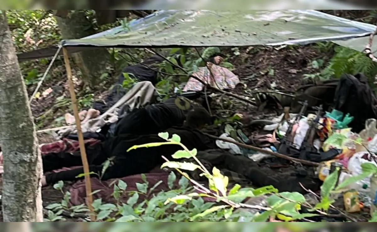 Visual evidence of the terrorists’ hideout, accessed by NDTV, provides a glimpse into their forest encampment. The image shows the bodies of the terrorists amidst bushes, surrounded by multiple assault rifles. A large green sheet, serving as a makeshift shelter, is seen hanging between trees, with a cluttered pile of clothes, blankets, plastic bags, food, and plates visible underneath.