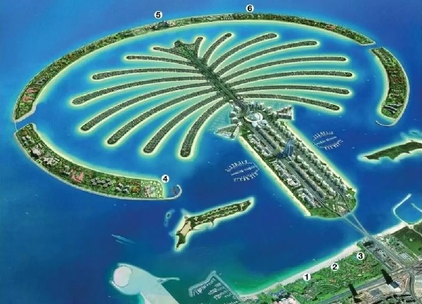 They show Palm Jumeirah, an artificial offshore island in Dubai and Apple’s ring-shaped headquarters in Cupertino, California.