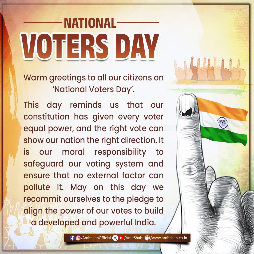 In a message shared on social media platform X, Shri Amit Shah said that National Voters’ Day reminds citizens that the Constitution of India has given equal power to every voter. He noted that a right and informed vote has the strength to guide the nation in the right direction.