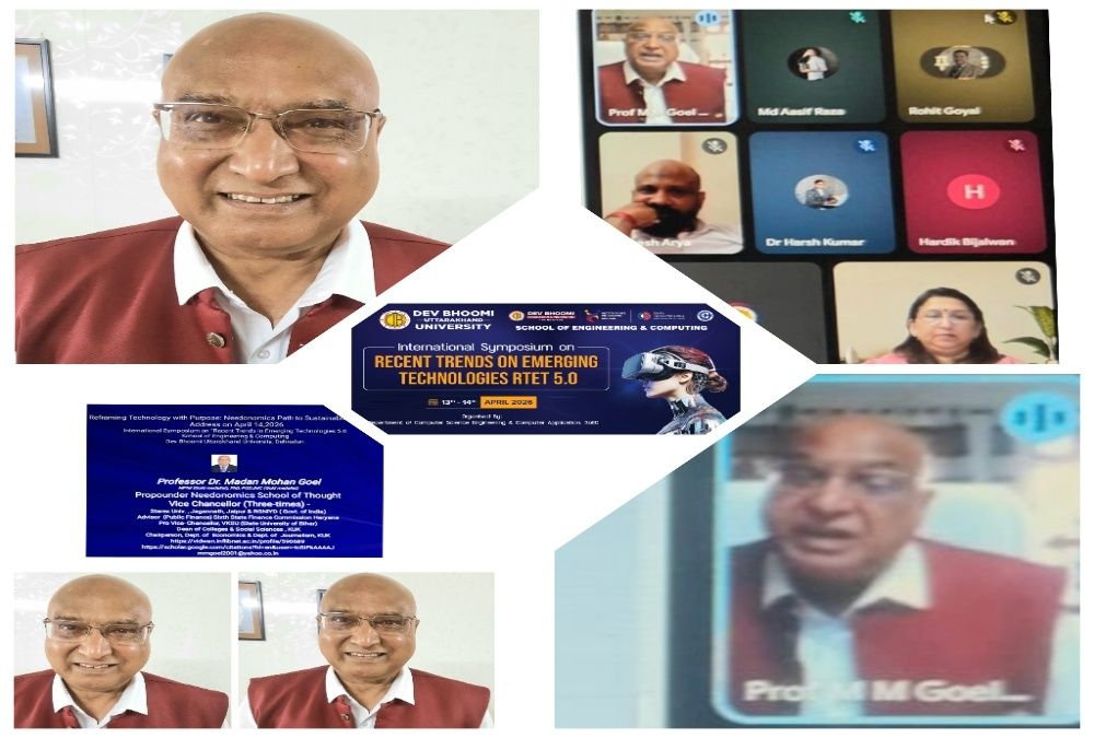 Dehradun, April 14 –Dev Bhoomi Uttarakhand University, School of Engineering & Computing, concluded a two-day International Symposium on “Recent Trends in Emerging Technologies 5.0”.The event featured Prof. Madan Mohan Goel, Propounder of the Needonomics School of Thought, former Vice-Chancellor (thrice), and superannuated Professor of Kurukshetra University, as the Keynote Speaker. He delivered an insightful address on “Reframing Technology with Purpose: Needonomics Path to Sustainable Progress.”
