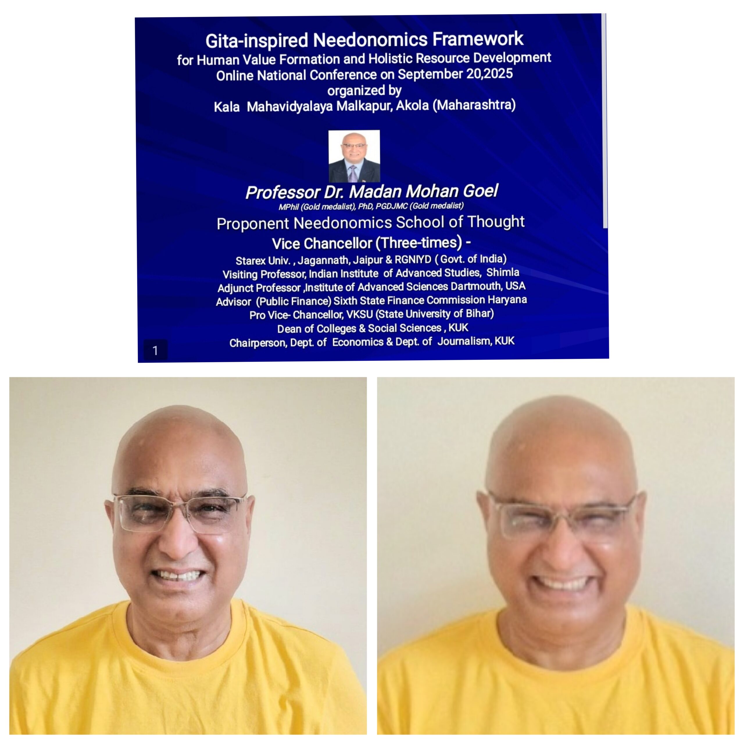 Akola (Maharashtra), Sep. 20, 2025 – At an Online National Conference organized by the Indian Social & Research Foundation in  Kala Mahavidyalaya Malkapur, Akola (Maharashtra)Prof. Madan Mohan Goel, Proponent of Needonomics and Former Vice-Chancellor (thrice), delivered the keynote address on the theme “Gita-Inspired Needonomics Framework for Human Value Formation and Holistic Resource Development.”