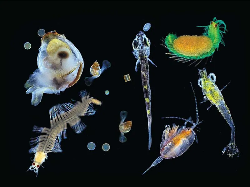 There are two main kinds. Those that harness sunlight: phytoplankton — microscopic marine plants that photosynthesize like greenery on land and, over geological time, have produced more than half the oxygen we breathe. And those that feed: zooplankton — tiny animals that graze on their plant-like cousins, hunt each other, and themselves become prey, sustaining fish, whales, and seabirds alike.