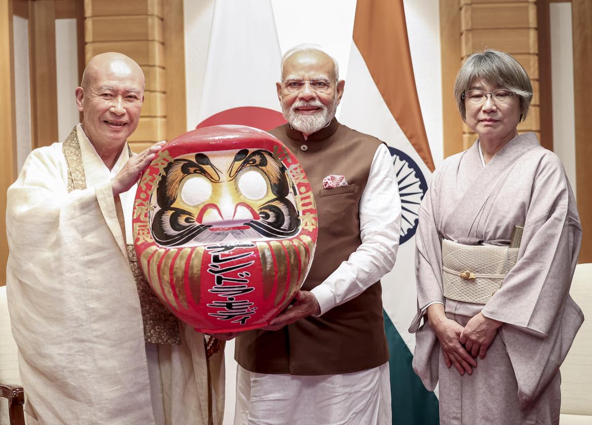 - PM Modi presented with Daruma doll by Rev Seishi Hirose in Tokyo.