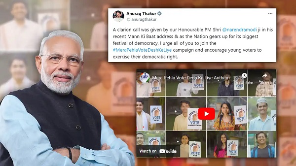 Union Minister Anurag Thakur took to X handle to share the anthem of the ‘Mera Pehla Vote Desh Ke Liye’ campaign, urging widespread dissemination of the message.