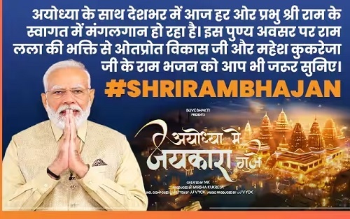 New Delhi, 8th Jan. Prime Minister Narendra Modi shared devotional bhajan “Ayodhya Mein Jaykara Gunjay” sung and composed by Vikas and created by Mahesh Kukreja.