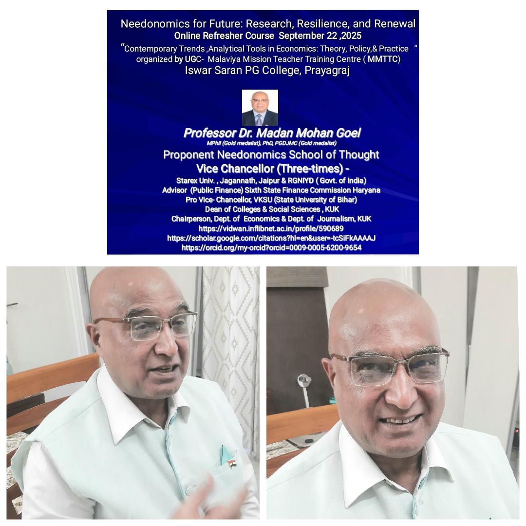 Prayagraj, 19th Sept: “To explore the future meaningfully, we must ground ourselves in the wisdom of Needonomics School of Thought (NST) ,” said Prof. Madan Mohan Goel, Propounder Needonomics School of Thought, three-time Vice-Chancellor, and superannuated Professor from Kurukshetra University. Today, he was addressing the participants of Refresher Course on “ Needonomics for Future: Research, Resilience, and Renewal ” organized by the UGC- Malaviya Mission Teacher Training Centre (MMTTC) , Iswar Saran PG College, Prayagraj.
