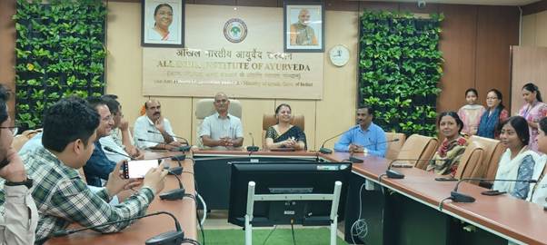 A formal ceremony at AIIA marked the occasion with a lamp-lighting and Dhanvantari Vandana. Former Executive Director Prof. (Dr.) Manjusha Rajagopal, Dean Prof. (Dr.) Mahesh Vyas, and staff welcomed him with floral bouquets.