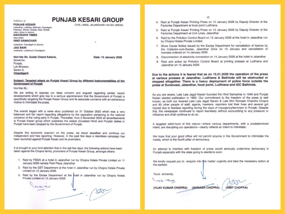 Chandigarh, 16th Jan: A major controversy has erupted over press freedom in Punjab after multiple offices of the Hindi daily Punjab Kesari were allegedly raided by Punjab Police and other state agencies following the publication of a critical news report on former Delhi Chief Minister Arvind Kejriwal.