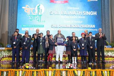 New Delhi, 26th Jan. Defence Minister Rajnath Singh along with Education Minister Dharmendra Pradhan felicitated ‘Super-100’ winners of Project Veer Gatha 3.0, in New Delhi on January 25, 2024. A cash prize of Rs 10,000, a medal and a certificate were given to each of the 100 winners.