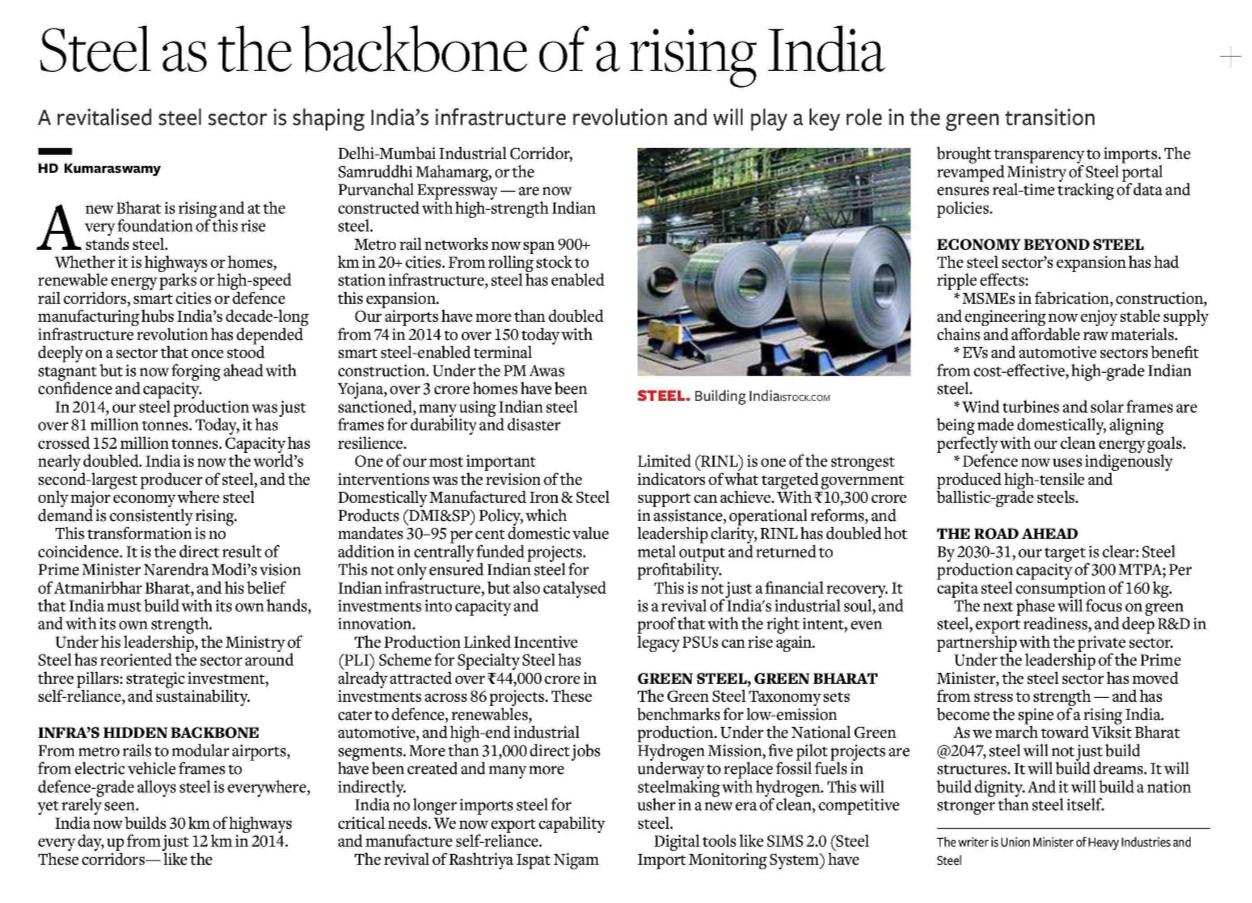 “From infrastructure and defence to electric mobility and clean energy, steel is the backbone of a rising India. Union Minister Shri @hd_kumaraswamy outlines how policy push and innovation are shaping India’s journey to becoming a global steel leader,” the Prime Minister wrote.