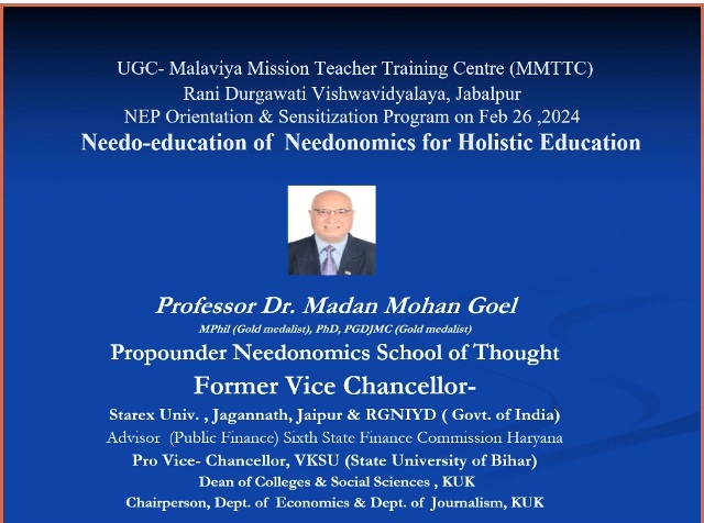 “To create needo-happiness in Viksit Bharat, we must understand holistic education mandated in National Education Policy as Jack of all and master of all,” believes Propounder Needonomics School of Thought Dr Madan Mohan Goel, Former Vice-Chancellor superannuated Professor from Kurukshetra University.