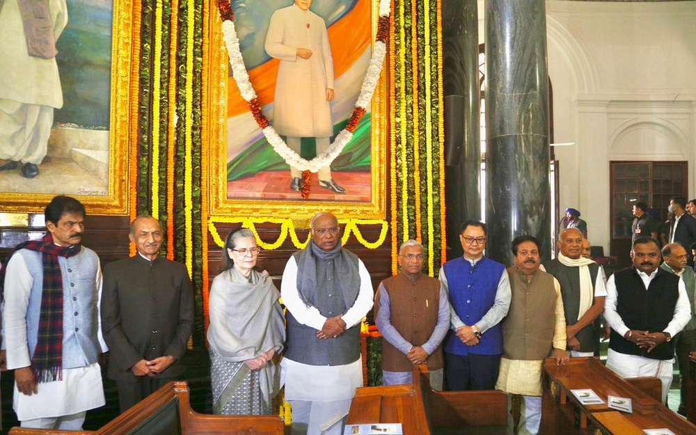 - Kiren Rijiju, Mallikarjun Kharge and Harivansh led floral tributes.