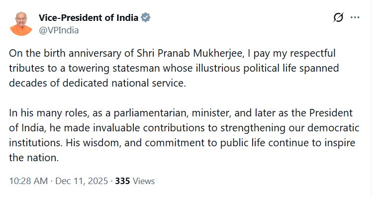 New Delhi, 11th Dec: Vice-President C. P. Radhakrishnan on Thursday paid heartfelt tributes to former President of India, Pranab Mukherjee, on his birth anniversary, remembering him as a towering statesman whose distinguished political journey shaped India’s democratic evolution.