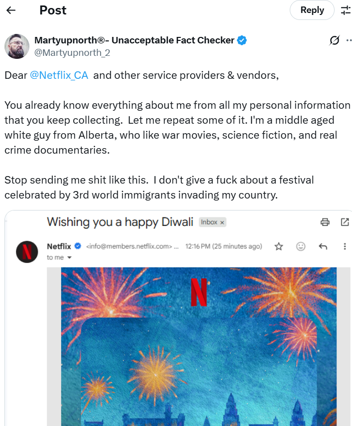 When an Alberta engineer in Canada chose to vent on social media following a basic “Happy Diwali” email, it was not just an individual breakdown. It was a reflection of a perilous and increasing trend — that cultural intolerance and racial bias are being gradually normalized in nations that previously boasted of being “liberal,” “inclusive, migrants taking over my country,” he wrote, after Netflix had sent him a Diwali greeting. A greeting — simply a string of warm festive text — was enough to fuel a hurricane of rage. Ironically, it wasn’t the greeting that was insulting; it was his refusal to accept cultural diversity without bitterness.