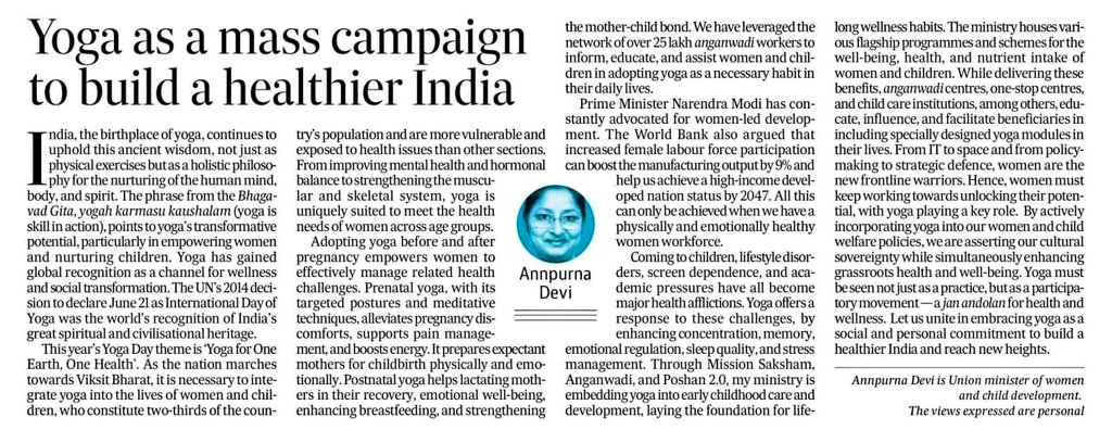 The article, originally shared by the minister, underscores how yoga is being incorporated into key health and nutrition programmes, including Anganwadi services and Poshan Abhiyaan, with a focus on improving physical and mental wellness among women and children.