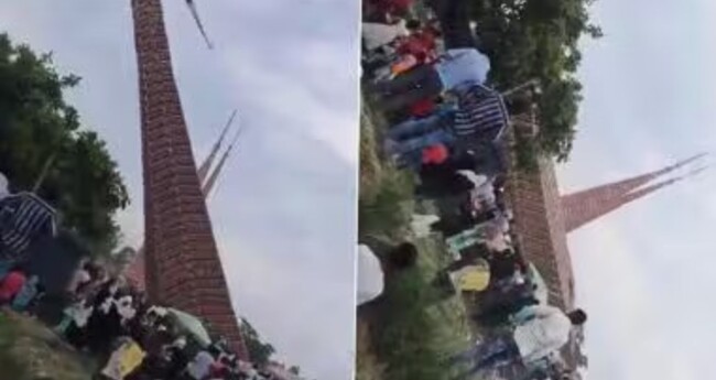 The video footage shows three massive Tazias — towering around 100 feet — made primarily of bamboo and decorated with colourful fabrics and paper. While two remained stable, one of them begins to tilt and then crumbles as onlookers react in alarm.