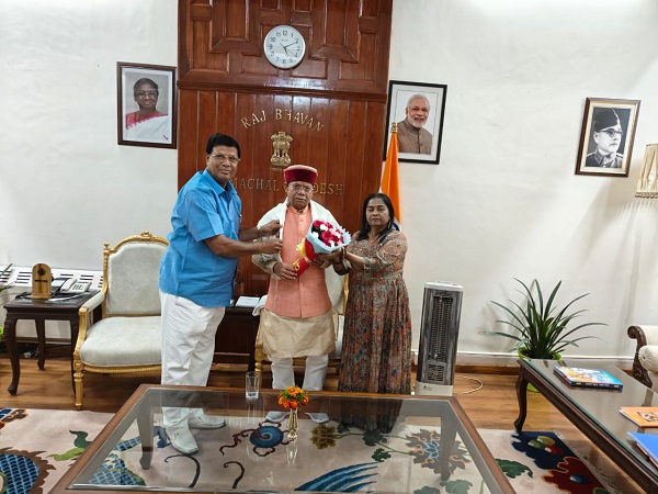 Shimla, 7th August. Abhay Sinha, Chairman of the Lok Nayak Jai Prakash Narayan Smriti Samiti, and his wife, Saroj Sinha, felicitated the Governor of Himachal Pradesh, Shiv Pratap Shukla, with a shawl and a bouquet of flowers at the Raj Bhavan in Shimla.