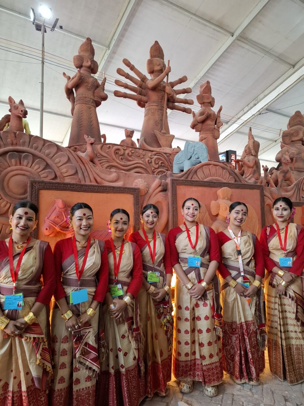 The trailer section of the tableau was designed as a graceful Mayurpangkhi boat, evoking Assam’s deep-rooted riverine heritage. Artisans were depicted shaping hiramati (local clay) into divine forms of deities such as Ganesh, Kartik, Durga, Lakshmi and Saraswati, showcasing the living process of terracotta craftsmanship.