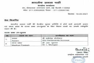 New Delhi, 18th Sep. The BJP has started the preparations for the Rajya Sabha seat of Assam and Madhya Pradesh. The candidates for the by-elections to be held from these seats have been declared by the party. Bharatiya Janata Party has declared Union Minister Sarbananda Sonowal as its candidate from Assam. On the other hand Minister of State, Dr. L. Murugan has been fielded from Madhya Pradesh.