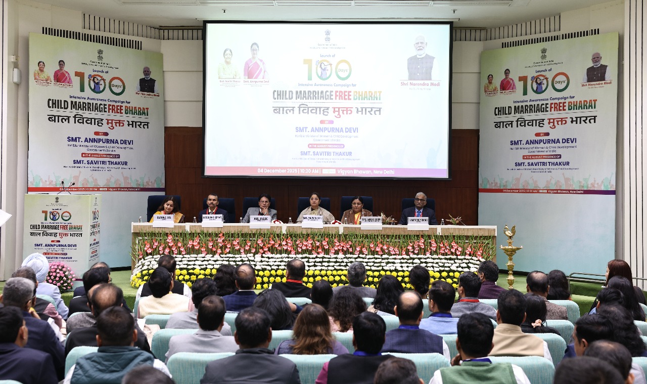 New Delhi, 5th Dec: The Ministry of Women and Child Development on Thursday launched a 100-day intensive awareness campaign to mark one year of the Bal Vivah Mukt Bharat (Child Marriage Free India) initiative. The national event was held at Vigyan Bhawan in New Delhi in the presence of Women and Child Development Minister Annpurna Devi and Minister of State Savitri Thakur.