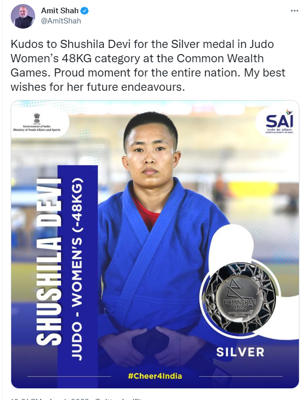 New Delhi, 2nd August. Union Home Minister Amit Shah has congratulated Shushila Devi for winning the Silver medal in Judo Women’s 48KG category at the CommonWealth Games 2022.