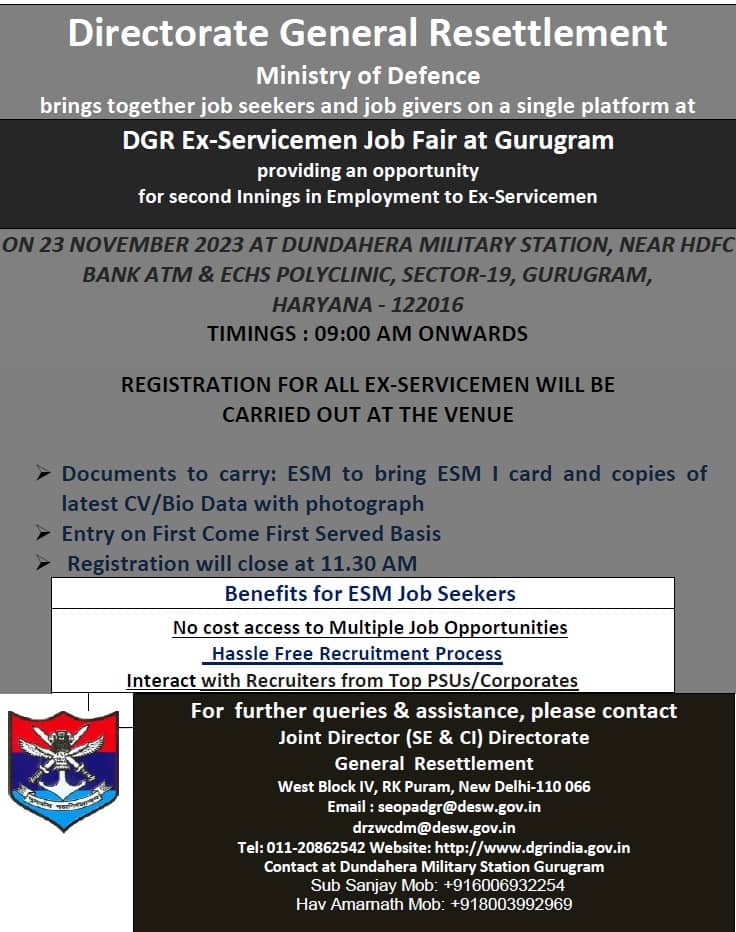 Gurugram, 24th Nov. Directorate General of Resettlement, Department of Ex-Servicemen Welfare, Ministry of Defence organised an Employment Seminar/Job Fair on 23 November 2023 at Dundahera Military Station, Gurugram to bring the Ex-Servicemen seeking re-employment and the job providers on a single platform.