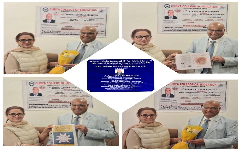Ambala, March 21, 2026 — “Gita-inspired Needonomics, as an integral part of the Indian Knowledge System (IKS), is essential for achieving holistic education under the National Education Policy (NEP),” asserted Prof. Madan Mohan Goel, Propounder Needonomics School of Thought, former Vice-Chancellor and superannuated Professor of Kurukshetra University, while addressing participants at an Online International Seminar organized by Surya College of Education, Bhanokheri (Ambala).