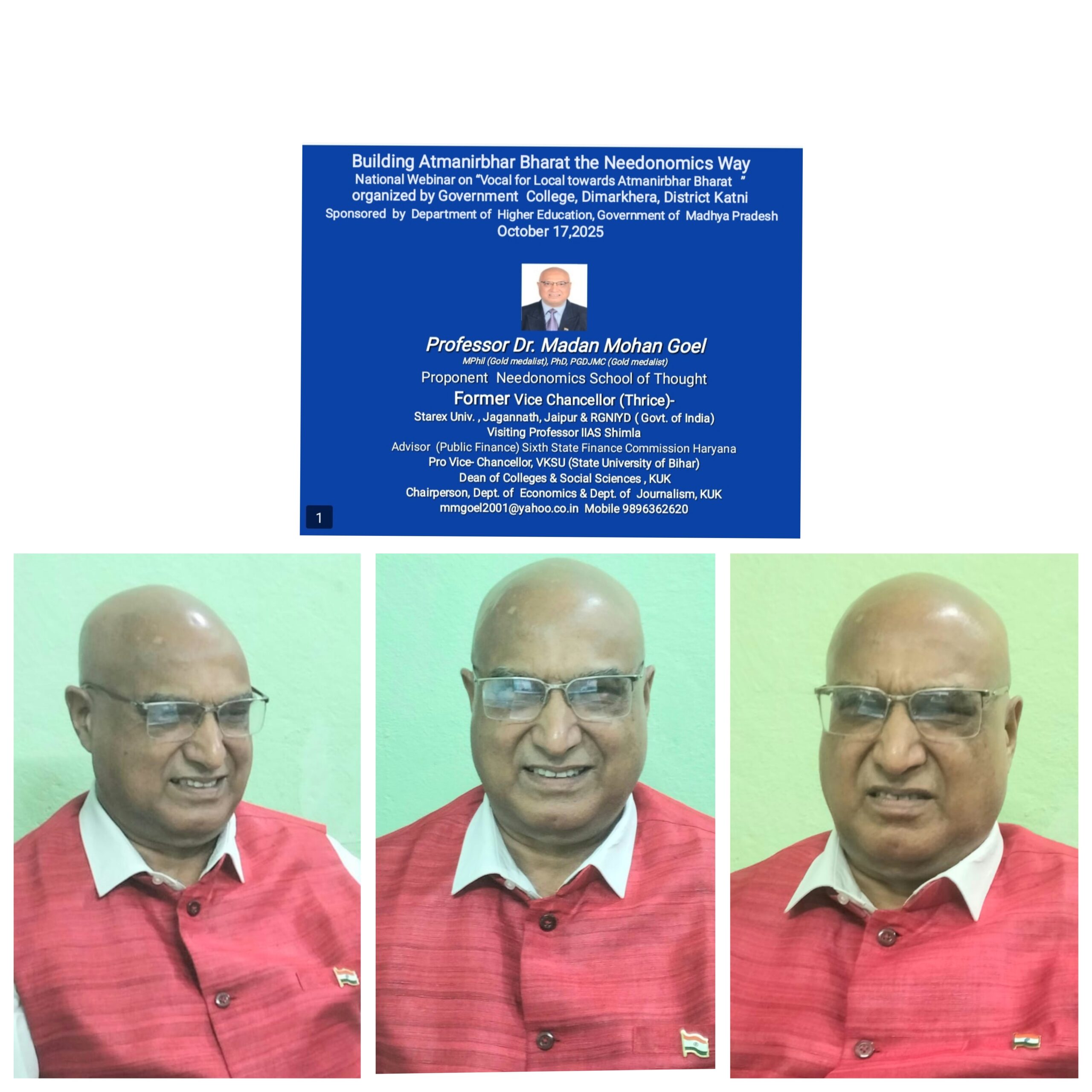 Dimarkhera, 17th October: “To build Atmanirbhar Bharat , we must adopt the principles of Needonomics—the economics of need-based living and decision-making,” said Prof. Madan Mohan Goel, Proponent of Needonomics, Former Vice-Chancellor (thrice), and Superannuated Professor of Kurukshetra University. He was addressing a National Webinar on “Vocal for Local towards Atmanirbhar Bharat” organized by Government College, Dimarkhera, District Katni, and sponsored by the Department of Higher Education, Government of Madhya Pradesh.