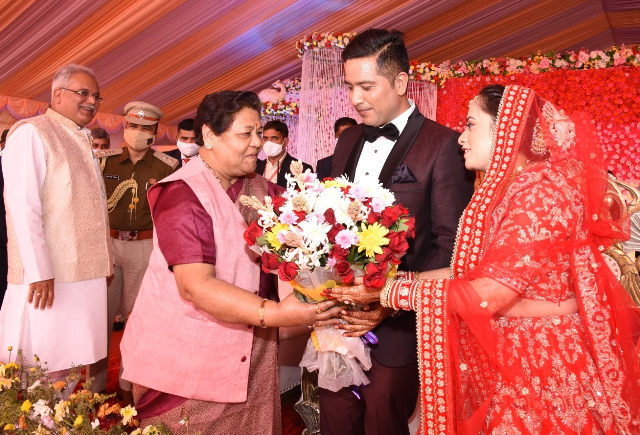 Raipur, 9th Feb. Governor Anusuiya Uikey attended the marriage blessing ceremony of Chaitanya Baghel, son of Chief Minister Bhupesh Baghel, at Patan, the development block headquarters of Durg district.