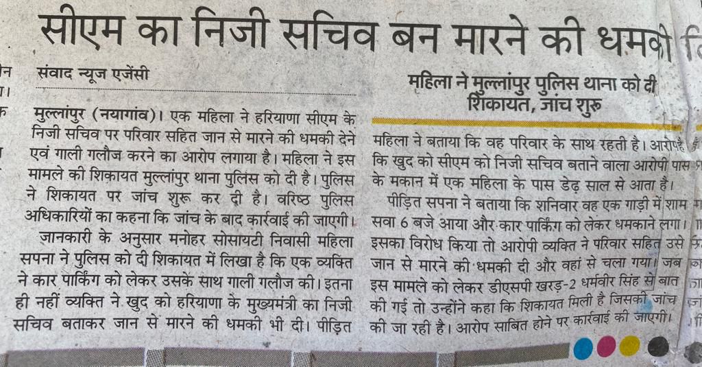 Trouble of Haryana BJP are mounting day by a woman of a society adjoining Chandigarh has complained to Punjab Police that a person with gunmen came to the society and following row over parking threatened her of killing his family dropping the name of CM.