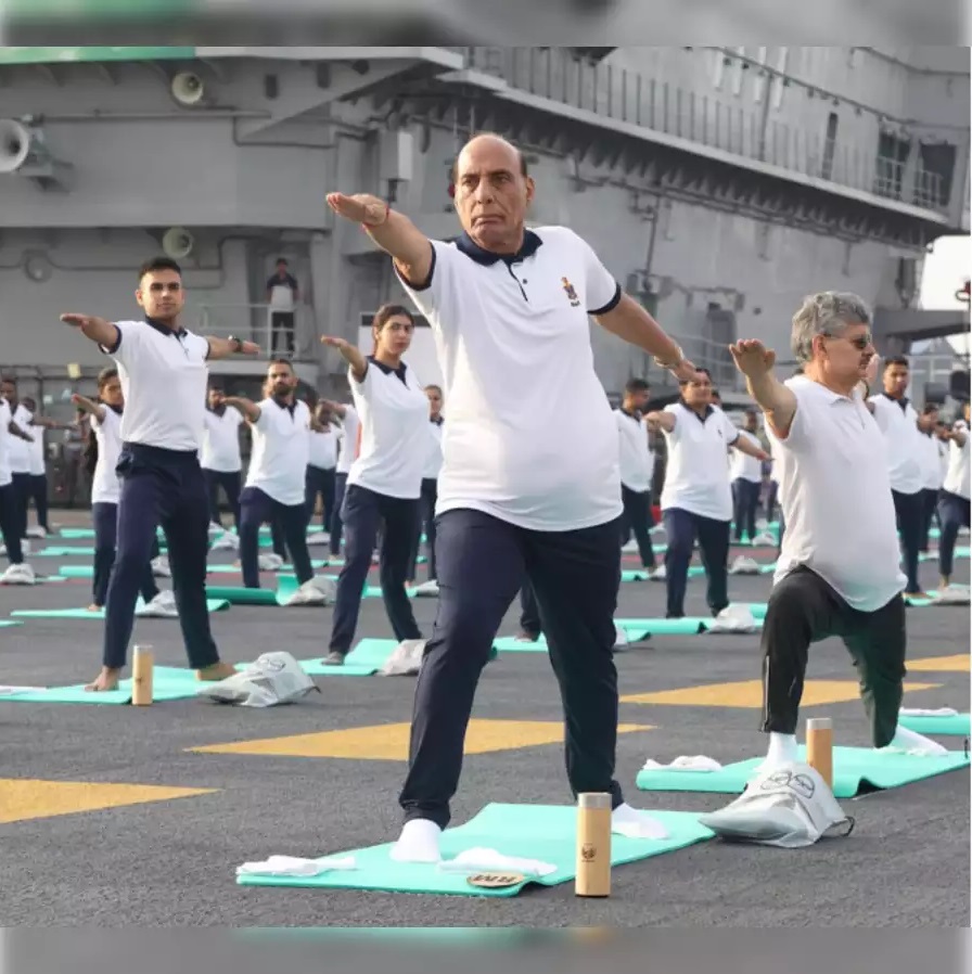 9th International Day of Yoga: Defence Minister performs Yoga with Armed Forces & Indian Coast Guard personnel onboard INS Vikrant