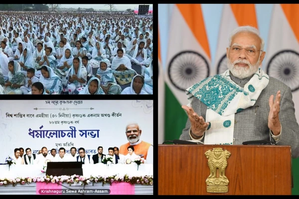 Barpeta, 4th Feb. Prime Minister Narendra Modi addressed the Krishnaguru Eknaam Akhanda Kirtan for World Peace, being held at Krishnaguru Sevashram at Barpeta, Assam via video conferencing on Friday.