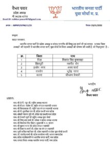 The letter stated, “With the consent of BJP State President and MP Honorable Shri Vishnu Dutt Sharma ji and all BJP District Presidents, the names of District Presidents of Bharatiya Janata Party, Yuva Morcha are announced.”