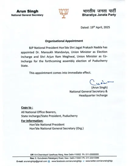 New Delhi: The BJP has kicked off preparations for the Puducherry Assembly elections by appointing Union Health Minister Mansukh Mandaviya as the party’s election in-charge for the Union Territory. Union Law Minister Arjun Ram Meghwal will assist him as co-incharge. Both appointments have come into effect immediately, signaling the BJP’s intent to intensify its campaign in the region.