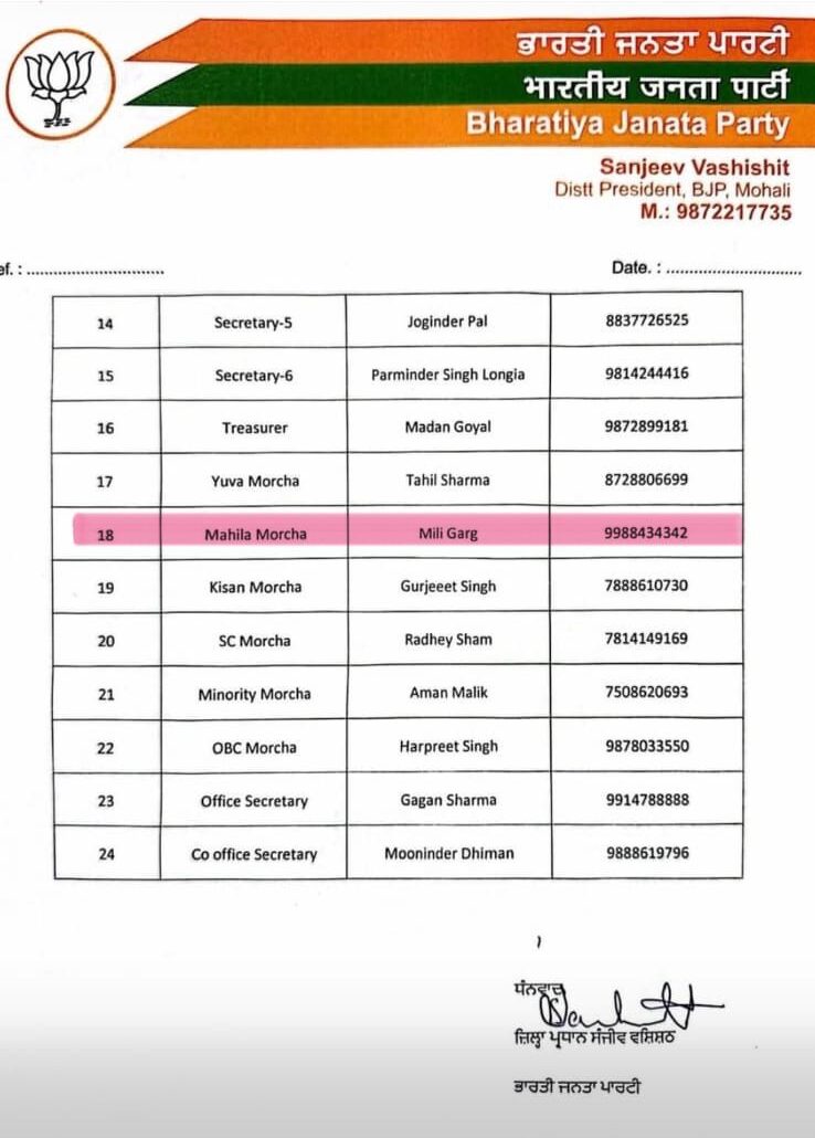 - Advocate Mili Garg has been reappointed as Mohali district Mahila Morcha president