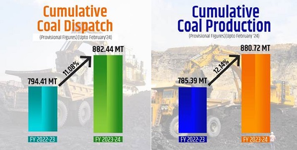 The cumulative coal production for the fiscal year 2023-24 has witnessed a substantial rise to 880.72 MT, reflecting a growth rate of 12.14% compared to the corresponding period in the previous fiscal year.