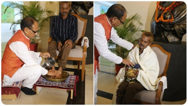 Bhopal, 6th July. Days after a guy urinated on tribal laborer Dashmat Rawat, Madhya Pradesh Chief Minister Shivraj Singh Chouhan met him and washed his feet at the CM House in Bhopal.