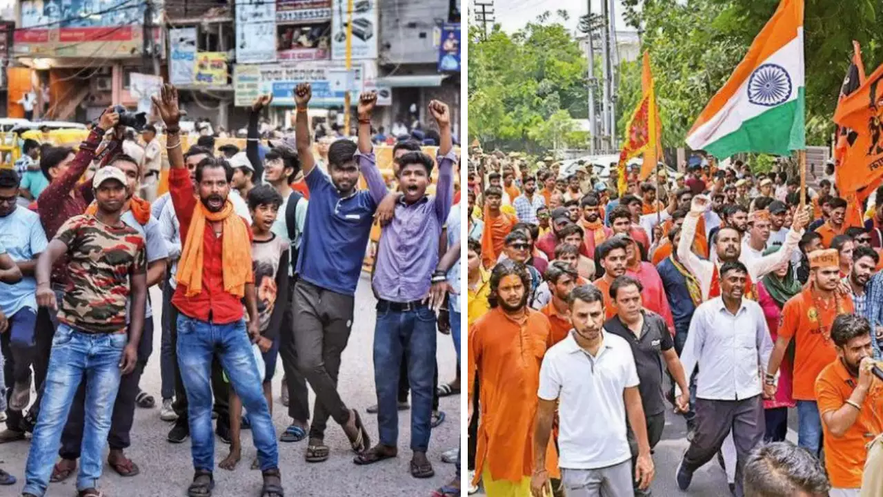 Carrying saffron flags and chanting slogans of ‘Jai Shri Ram’, ‘Har Har Mahadev’, and ‘Vande Mataram’, protesters staged a sit-in at the Badarpur border, blocking the road and hampering traffic movement from Faridabad to Delhi.